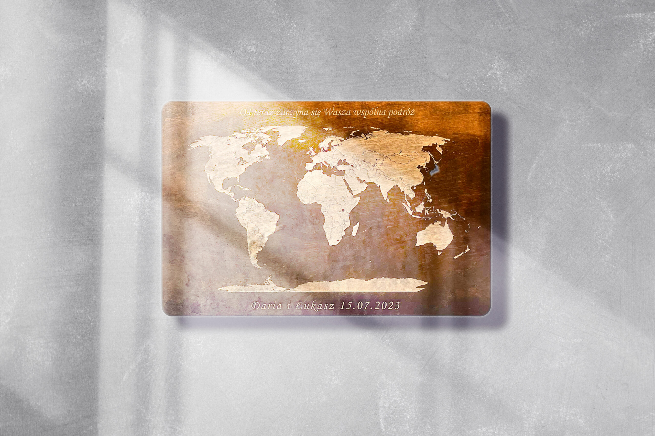 To może być wspaniały prezent na wyjątkową okazję, na przykład jako podarunek ślubny. Na górze mapy możesz umieścić zdanie, na przykład „Od teraz zaczyna się Wasza wspólna podróż”, a na dole datę tego szczególnego dnia. Pamiętaj, aby po zakupie napisać nam treść grawerowanego napisu!